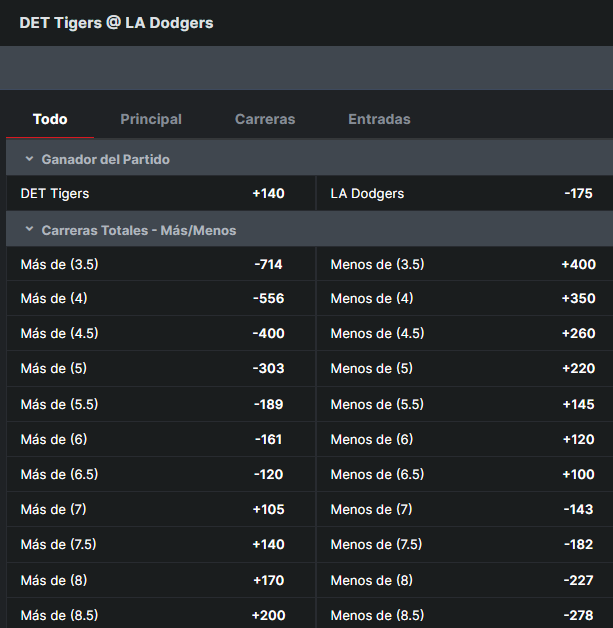 En el caso de los Tigers vs. Dodges ,tendrás que decidir si se realizarán más o menos del número seleccionado de carreras en total durante su próximo Partido para Apuestas en Vivo, con mayores probabilidades de que suceda el primer resultado.