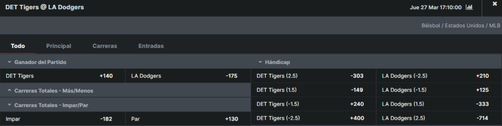 Por ejemplo, en el juego de los Tigers vs Dodgers de la Major League Basebal (MLB) verás Momios de +140 y -175 respectivamente en apuesta Moneyline.